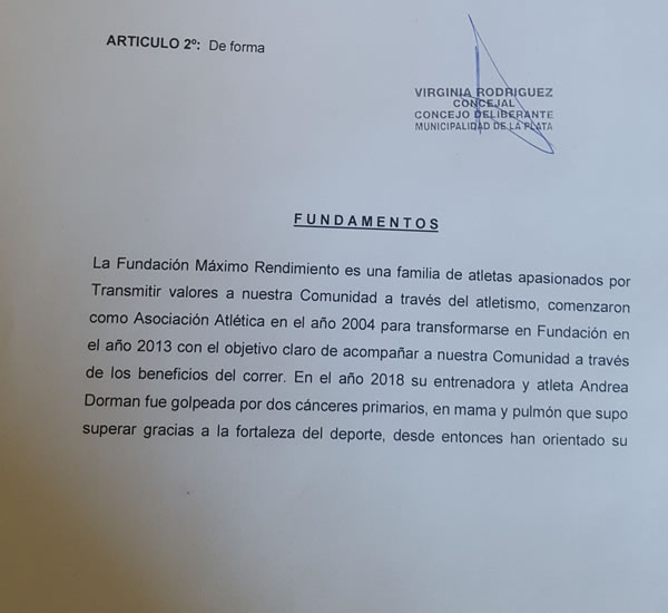 Declaración de Interés Municipal evento atlético "Yo Corro Por la Vida", organizado por Fundación Máximo Rendimiento