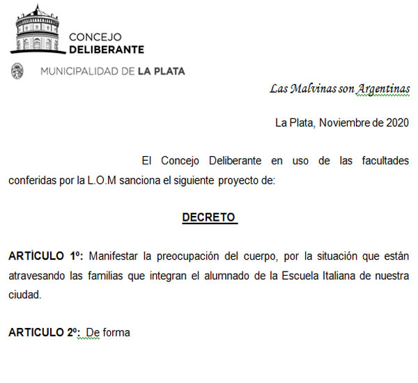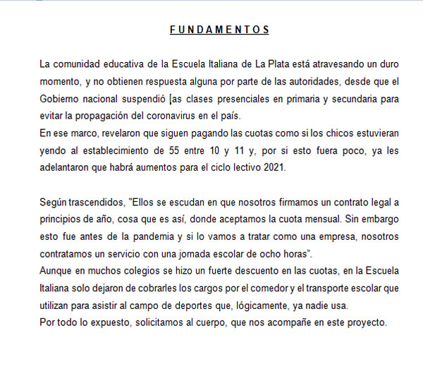 Preocupación por situación familias de alumnos Escuela Italiana de La Plata